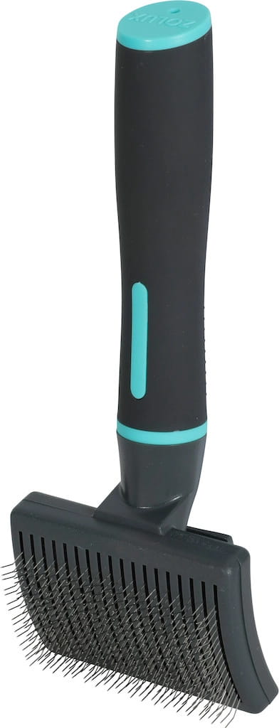 Zolux Anah 470806 is a small self-cleaning poodle brush whose flexible, curved stainless steel needles enable gentle brushing. Comfortable to use and easy to keep clean. Thanks to the convenient button, it effectively and quickly removes hair from the needles. It detangles, removes dead undercoat and smoothes the coat. Suitable for all coat types.